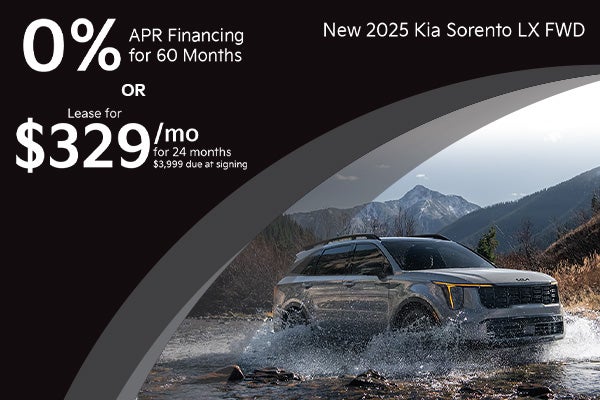 Ex: New 2025 Kia Sorento LX FWD 4D Sport Utility 8-Speed Automatic. VIN: 5XYRG4JCXSG347352. $329 per month lease for 24 months. With approved credit. 10,000 miles per year. $3,999 due at signing. MSRP: $35,420. 0% APR for 60 months. $16.67 per month per every $1,000 borrowed. Not all will qualify. APR financing subject to credit approval by Kia Finance America (KFA) and not available on balloon financing. If provided, Advertised Price EXCLUDES all optional dealer offered items, accessories, or product addendums optionally selected by the purchaser, dealer document processing fee of $797 per TCA 55-17-114, and state and local taxes, tags, registration and title fees. Advertised prices INCLUDE factory-installed options installed by the manufacturer and non-optional dealer-installed accessories already installed on the vehicle by the dealer at time of advertising. See dealer for details. Offer expires 03/31/2026.