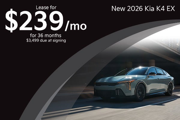 Ex: New 2026 Kia K4 EX 4D Sedan IVT. VIN: 3KPFU4DE0SE242695. $239 per month lease for 24 months. With approved credit. 10,000 miles per year. $3,499 due at signing. MSRP: $25,375. Prices exclude optional equipment selected by the purchaser, dealer documentation fee of $797 per TCA 55-17-114, and state and local taxes, tags, registration and title fees. Advertised prices include factory-installed options installed by the manufacturer and dealer-installed accessories already installed on the vehicle by the dealer at time of advertising. Not all qualify. Security deposit not required. On select models. See dealer for details. Offer expires 03/02/2025.
