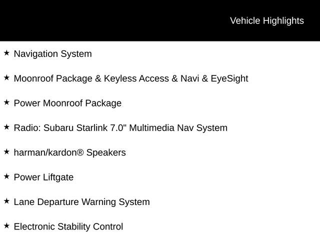 Adaptive Cruise Control, Auto-Dimming Rear View Compass Mirror w/Homelink, Electronic Stability Control, Fully automatic headlights, harman/kardon® Speakers, Heated front seats, Heated rear seats, High-Intensity Discharge Headlights, Lane Departure Warning System, Moonroof Package & Keyless Access & Navi & EyeSight, Navigation System, Perforated Leather-Trimmed Upholstery, Power Liftgate, Power Moonroof Package, Radio: Subaru Starlink 7.0 Multimedia Nav System, Wheels: 18 x 7.0 Aluminum Alloy w/Machine Finish.