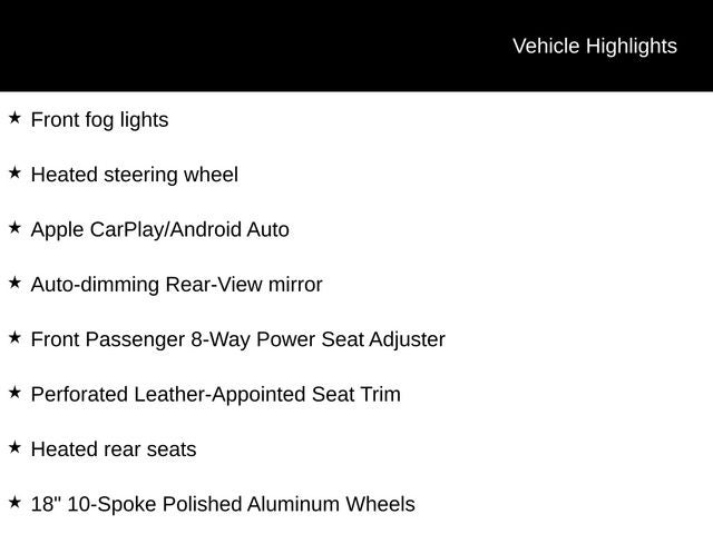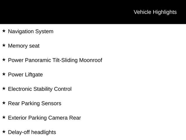 18 10-Spoke Polished Aluminum Wheels, Apple CarPlay/Android Auto, Auto-dimming Rear-View mirror, Delay-off headlights, Electronic Stability Control, Exterior Parking Camera Rear, Front fog lights, Front Passenger 8-Way Power Seat Adjuster, Heated rear seats, Heated steering wheel, Memory seat, Navigation System, Perforated Leather-Appointed Seat Trim, Power Liftgate, Power Panoramic Tilt-Sliding Moonroof, Rear Parking Sensors.