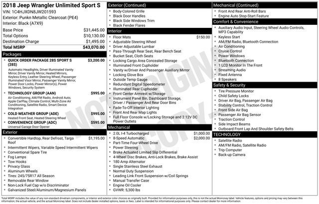 At our dealership, we take pride in offering our customers exceptional value and a seamless purchasing process. This 2018 Jeep Wrangler Unlimited Sport S is a testament to our commitment to providing high-quality vehicles that exceed your expectations. We invite you to experience the thrill of owning this remarkable SUV for yourself. Schedule a test drive today and let us show you why the Wrangler Unlimited Sport S is the perfect companion for your next adventure.