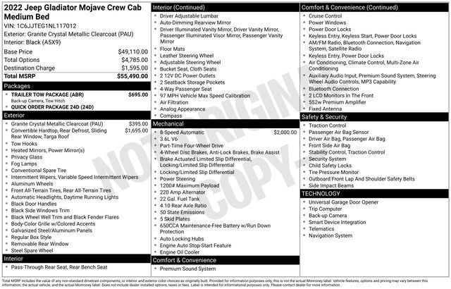 TRANSMISSION: 8-SPEED AUTOMATIC (850RE) Transmission Skid Plate, Selec-Speed Control, BLACK 3-PIECE HARD TOP Freedom Panel Storage Bag, Rear Window Defroster, Rear Sliding Window, TRAILER TOW PACKAGE Trailer Hitch Zoom, Class IV Receiver Hitch, Heavy Duty Engine Cooling, 240 Amp Alternator, ENGINE: 3.6L V6 24V VVT UPG I W/ESS (STD)