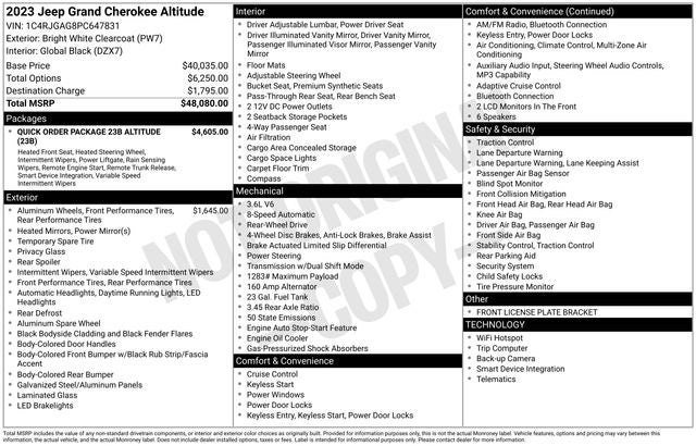 QUICK ORDER PACKAGE 23B ALTITUDE Engine: 3.6L V6 24V VVT UPG I w/ESS, Transmission: 8-Speed Automatic 8HP50, Selectable Tire Fill Alert, Remote Start System, Rain Sensitive Windshield Wipers, Wireless Charging Pad, Heated Front Seats, Altitude Appearance Package, Black Headliner, Delete Laredo Badge, 115V Auxiliary Power Outlet, Gloss Black Exterior Accents, Heated Steering Wheel, Power Liftgate, WHEELS: 20 X 8.5 GLOSS BLACK PAINTED ALUMINUM Tires: 265/50R20 BSW A/S LRR, TRANSMISSION: 8-SPEED AUTOMATIC 8HP50, ENGINE: 3.6L V6 24V VVT UPG I W/ESS (STD)