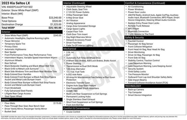 This Seltos is powered by a 2.0L I4 MPI engine paired with a CVT transmission and All-Wheel Drive, providing a smooth and efficient driving experience. With an EPA-estimated 27 MPG in the city and 31 MPG on the highway, this SUV offers impressive fuel economy to help you save at the pump.
